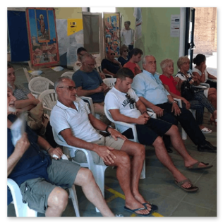 Al centro, per dividere le due scene, vi è dipinta una nuvola a mo’ di mezza cornice con al centro lo stemma del comune di Porto Recanati di cui San Giovanni Battista è protettore.