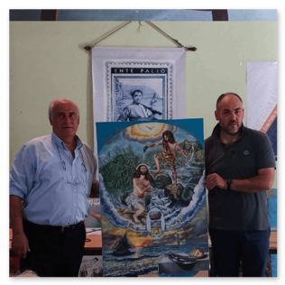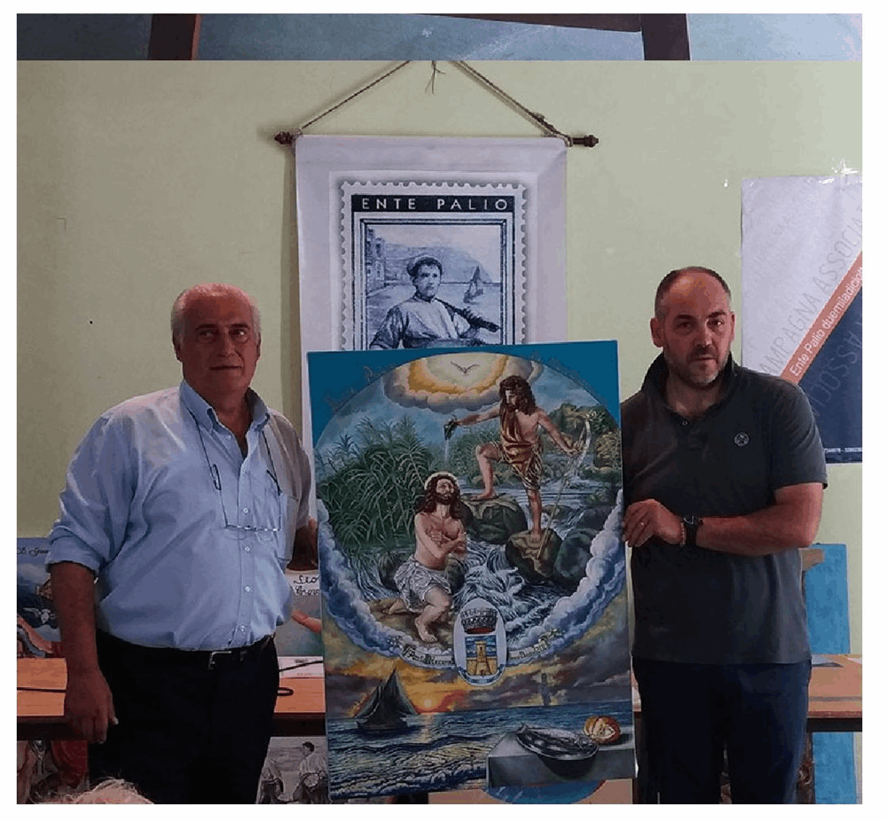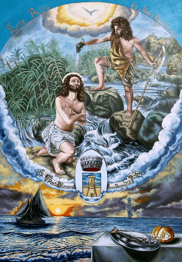 Il dipinto, eseguito a tempera acrilica su tela, intitolato Battesimo di Cristo e allegoria del Palio di San Giovanni potremmo dire che rappresenta due dipinti in uno, anche se entrambi sono legati da un solo significato quello di alcuni episodi evangelici.